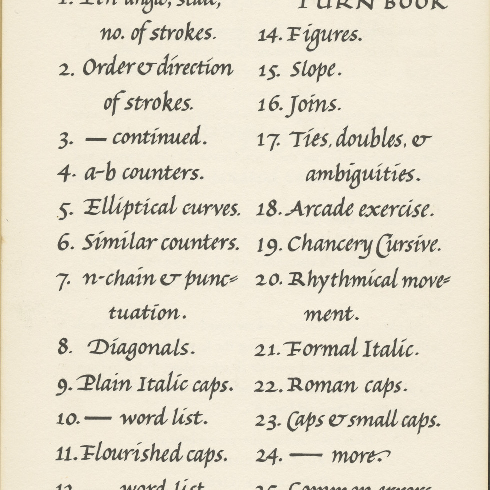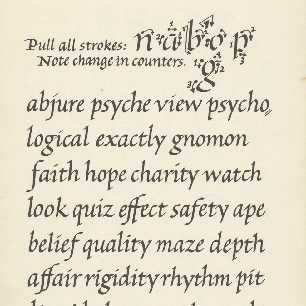After he began teaching at Reed in 1929, Lloyd J. Reynolds privately studied paleography “with pen in hand” and continued to do so for many years thereafter, laying solid historic groundwork for his own calligraphy and teaching of his specialty, italic handwriting. Then in 1954, the scholar-teacher Reynolds revealed himself as a master scribe, publishing his first handwriting manual, Edged Pen Alphabets, a small scholarly booklet including a hand-lettered portfolio of historic and modern letterforms.